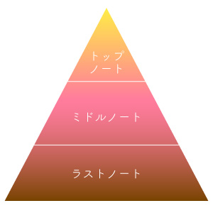 つけてすぐに香るのは「トップノート」、その後が「ミドルノート」(別名ハートノート)、そして消えていくまでが「ラストノート」(別名ボトムノート、ラスティングノート)というふうに表現されます。